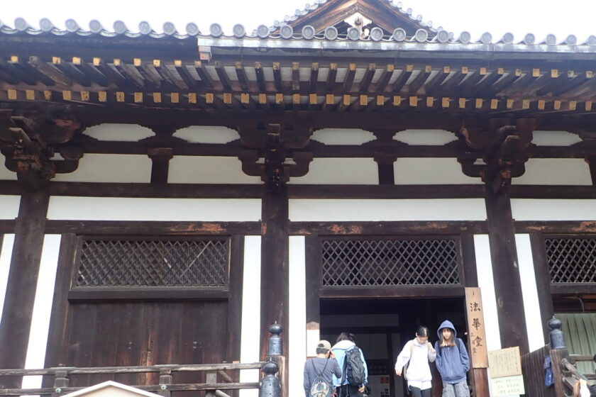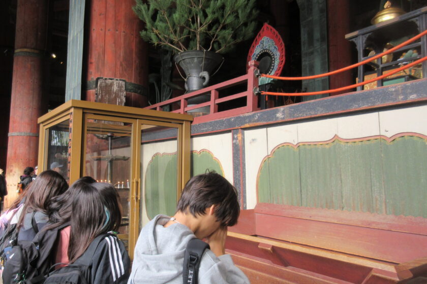 東大寺三月堂では、法華堂(ほっけどう)の不空羂索観音(ふくうけんさくかんのん)を拝みながらお話を伺いました。観音様の両手の間に水晶があることや、観音様がかぶっている宝冠の上の方にも水晶があることなどをうかがいました。子ども達は、熱心にお話を聞き、質問をしていました。