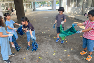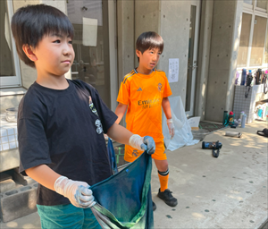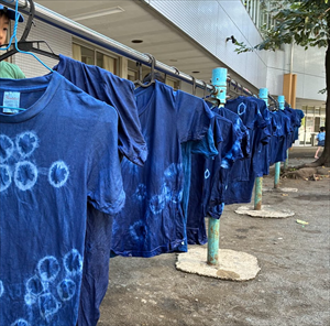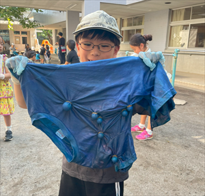 Tシャツはしぼり染めの方法で模様を付けました。ビー玉やおはじきをTシャツでくるみ輪ゴムでとめていく方法です。輪ゴムできつく縛られているところには染液がしみ込まないので色がつきません。こどもたちはどんな大きさにしようか、場所はどこにしようか、出来上がりの様子を想像しながら模様をつけていきました。