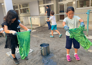 藍の染料につけて、100秒よくしみこませます。飛び散らないように慎重に作業を進めていきました。どの子も「くさい」と顔をしかめていました。