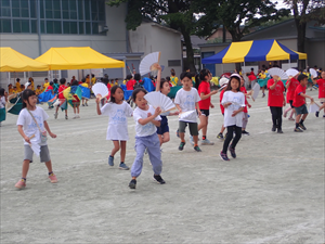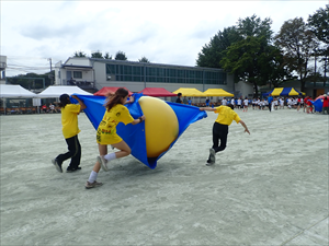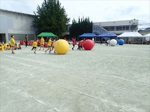 実際にやってみたのが今回が初めて。1年生から6年生までが協力して大玉を転がして、つないでいきました。