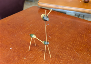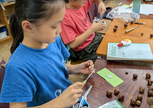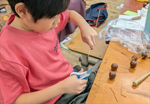 ドングリに目打ちで穴をあけて、木工用ボンドを付け、竹ひごをさすと簡単などんぐりゴマができます。これを基本形として、手をつけたり、足をつけたり、油性マジックで目玉をつけたりして、自由に工作を楽しみました。