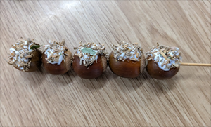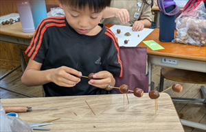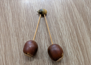 ドングリを竹ひごで縦に5つ貫いて「みたらし団子」をつくりました。おいしそう!