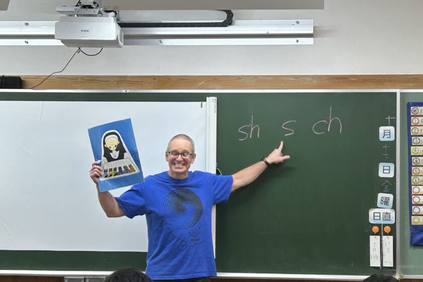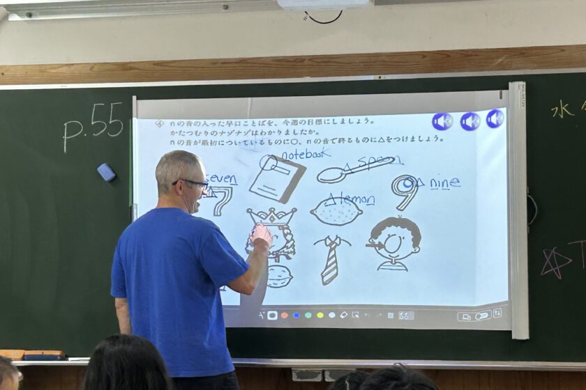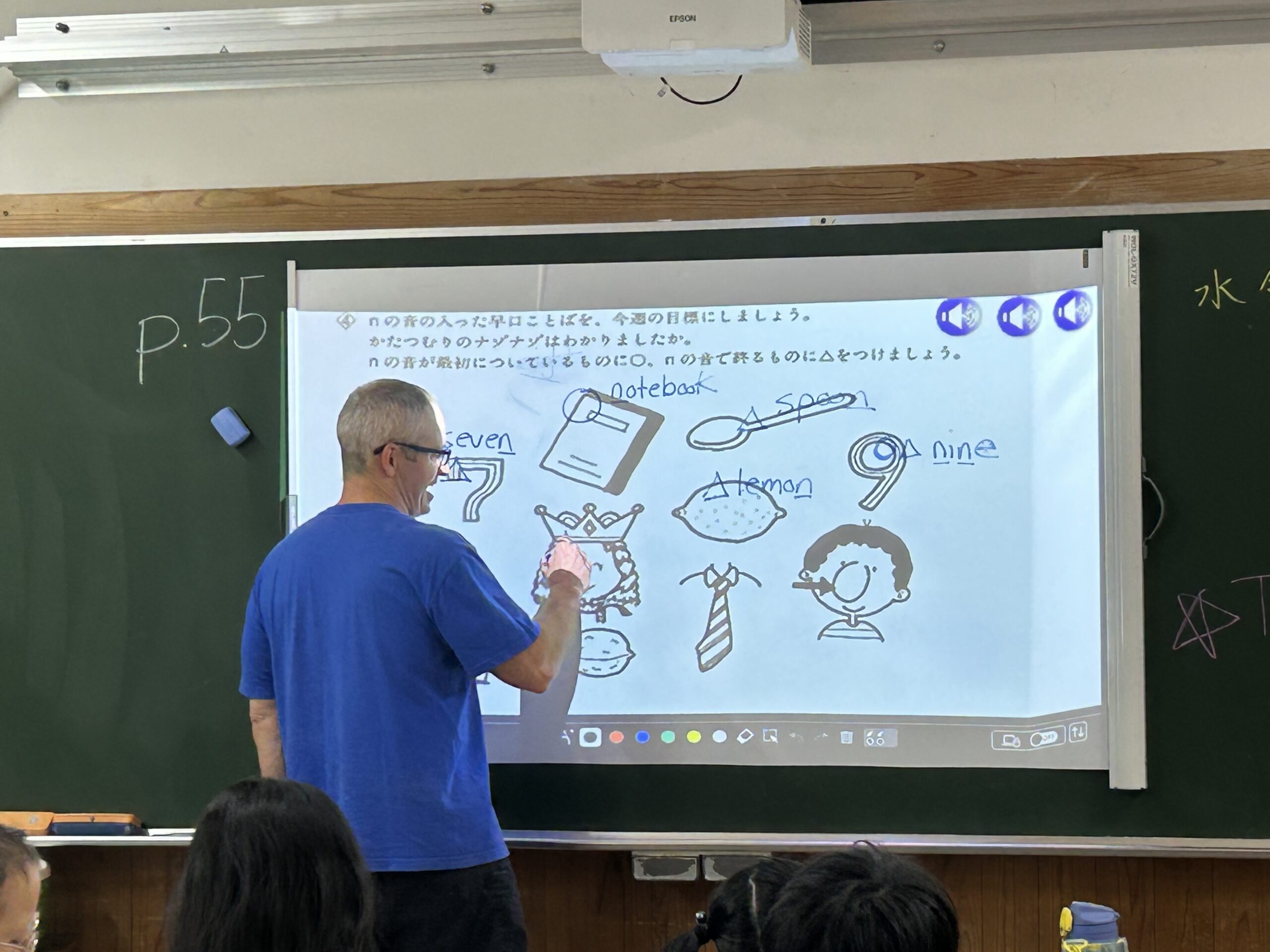 その後、「N」が単語の先頭につく絵に〇、「n」が単語の後ろにつく絵に△をつけよう!というワークを、みんなでワイワイ言いながら進めると、6時間目終了のチャイムが!