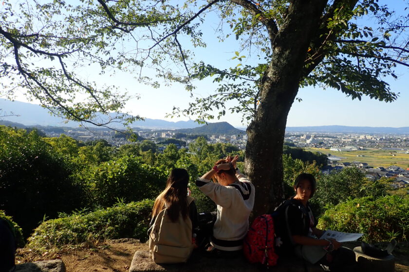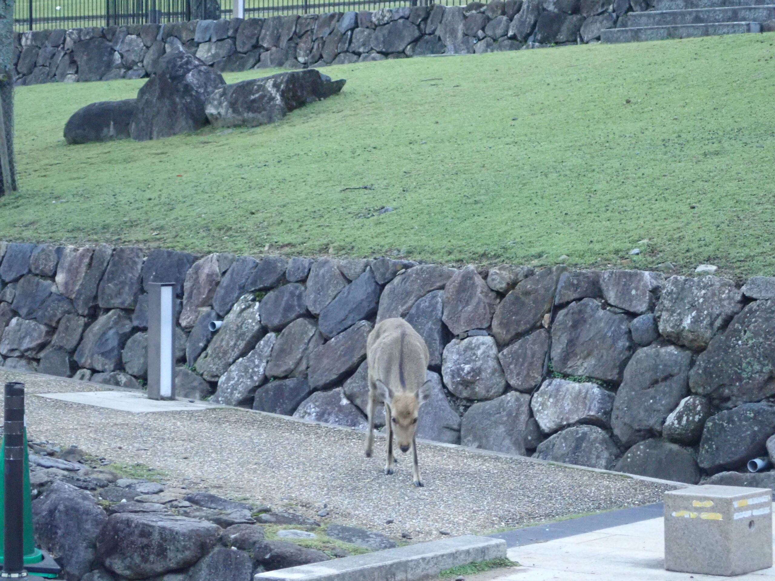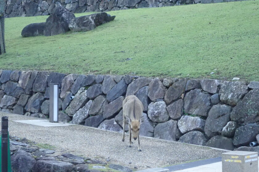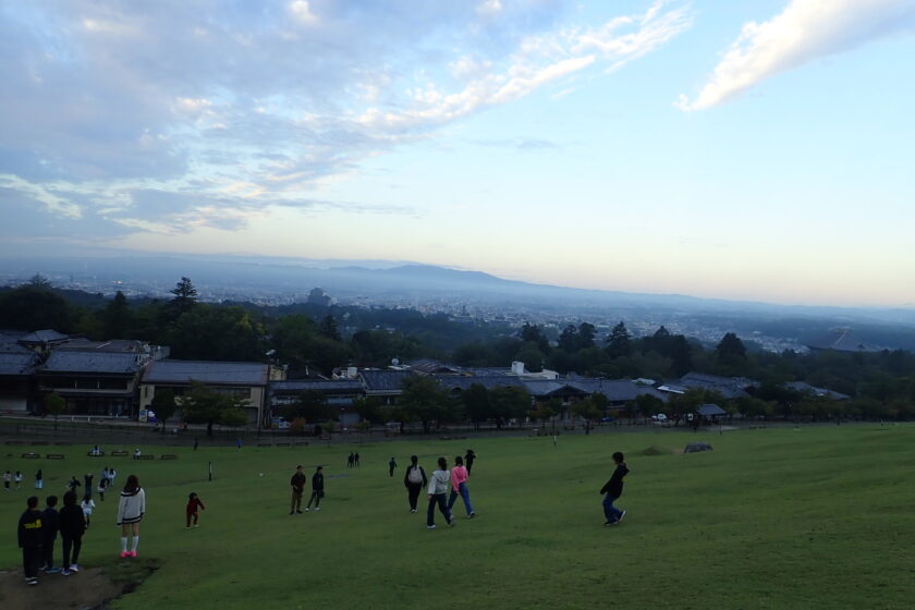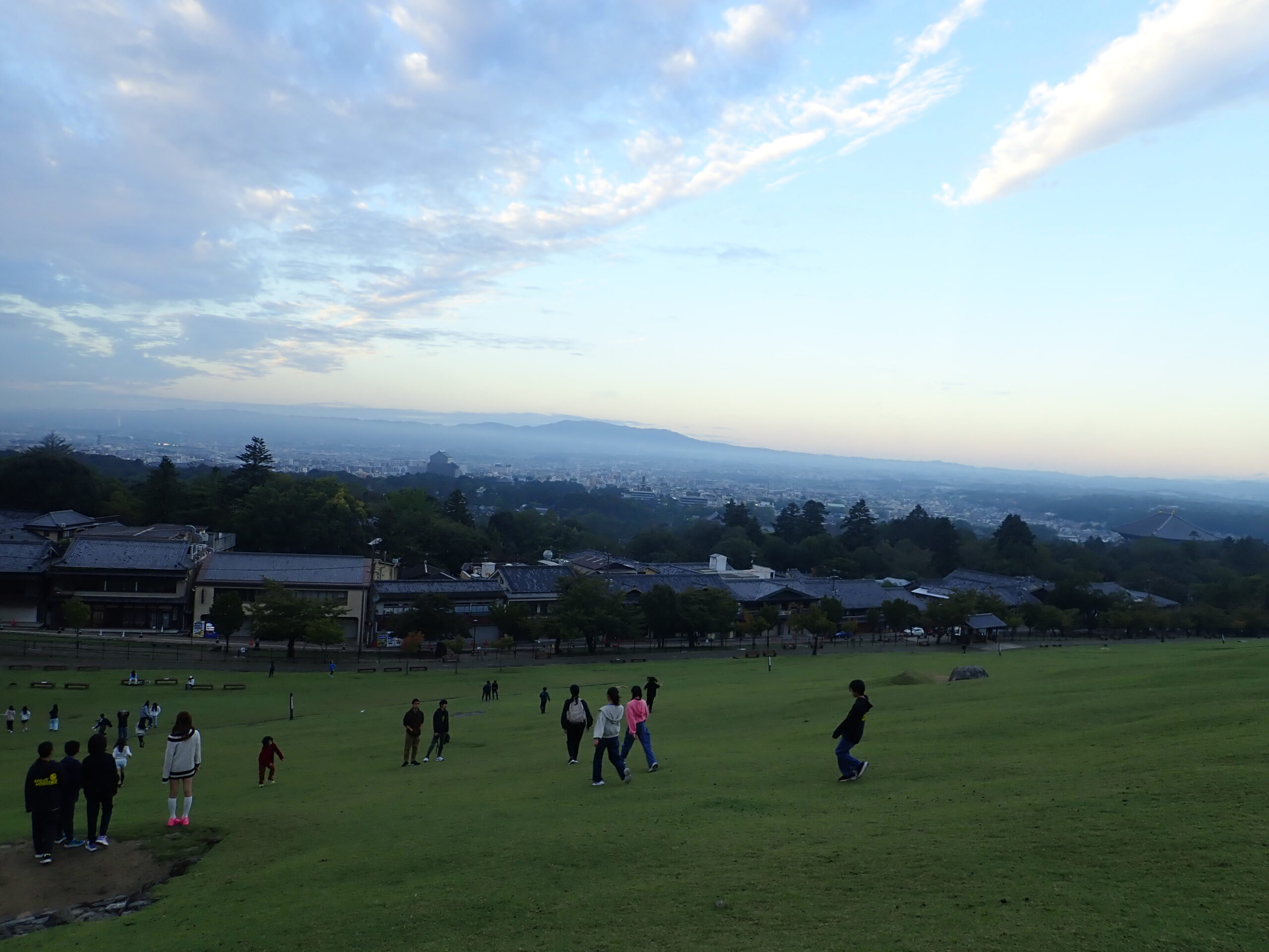 眠い目をこすりながら、部屋ごとに集合すると鹿のお出迎え。鹿に挨拶をし若草山に登ると…。素晴らしい景色を眺めることができました。
