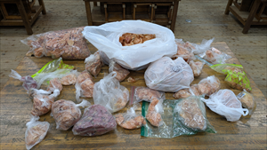 今から2か月前、9月の3年生保護者会で「たまねぎの皮を集めて学校に持ってきてください」とお願いしたところ、毎日少しずつたまっていき、とてもたくさんのたまねぎの皮が集まりました。90Lの袋が満タンになるほどです。3年生の保護者のみなさま、ご協力ありがとうございました。