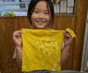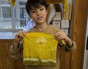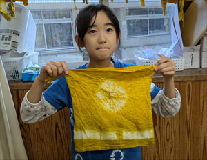 媒染液に入れて、再び10分待ちます。橙色が鮮やかな黄色や渋いカーキ色に変わってよりハッキリとしてきました。1枚の布にその2色を使って染めた子もいました。半分だけミョウバンに10分間浸して、その後もう半分を鉄に10分間浸すと2色染めの完成です。