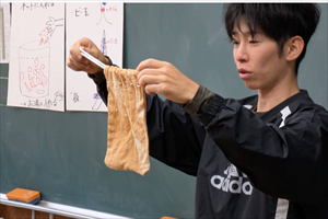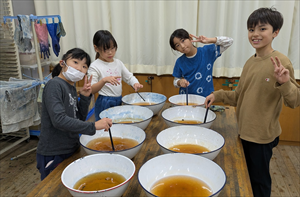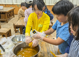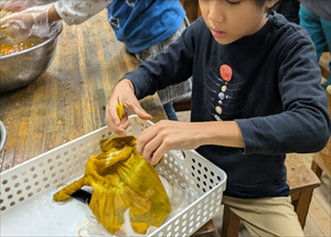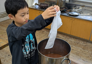 みんなが家から持ち寄ったたまねぎの皮を洗濯ネットに入れ、約40分間ぐつぐつと煮込みました。徐々にたまねぎスープのようないいにおいが教室中に立ち込めましたね。
