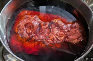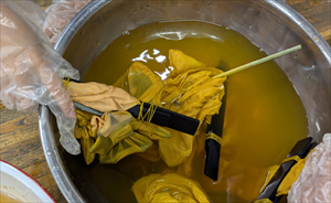 はじめは無色透明だったお湯がだんだんと濃いオレンジ色の液体に変わってきました。そしていよいよ、このたまねぎの染液に布を入れます。