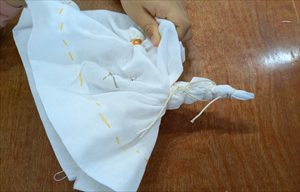 よく水で洗い、模様をつけるために使った輪ゴムやたこ糸を外しました。布を切ってしまわないように、慎重に慎重に取り外していきます。そして乾かして、ひもを通したら出来上がり。世界に一つだけの巾着袋の完成です。