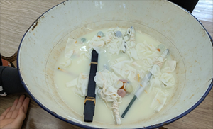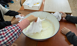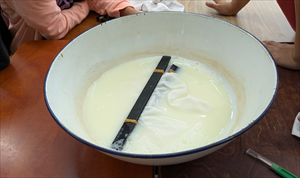 次に、豆乳または牛乳を水で薄めた液に10分間浸しました。この作業は2年生の藍染の時にはありませんでしたね。たまねぎの染液がより濃く染まるように十分にしみ込ませました。