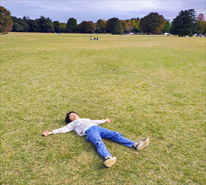 ちょうど紅葉のシーズン、イチョウやモミジの紅葉もしっかりと楽しむことができました。イチョウ並木はまさに「黄色い天井に黄色い絨毯」。上も下もイチョウにつつまれてなんだか吸い込まれそう。みんなの原っぱに到着すると、思わずゴロンと寝転んでのんびりのんびりくつろぎました。