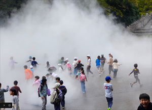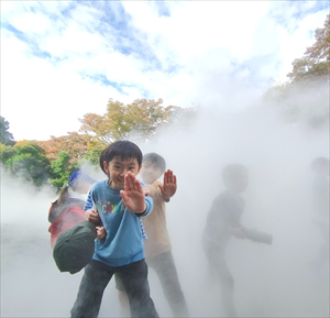 「霧の森」に到着。真っ白な霧に包まれて子供たちも大はしゃぎ。なんだか魔法使いになったみたいですね。