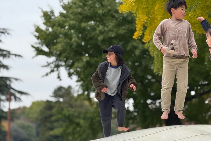 ごちそうさまをしたら、たくさんの遊具で遊びます。ふわふわのトランポリンで転がったり、おにごっこをしたり、滑り台やぶらんこで遊んだり。中には広い芝生でカラスと仲良くなろうと、カラスを待っている子達も。余裕ある時間の中では、子どもは色々な遊びを思いついて、いつまでも楽しめるんだなぁと、先生達は微笑ましく見守っていました。