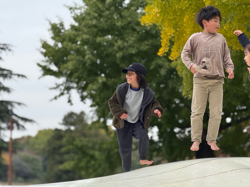 学校を出発して約2時間。歩いて、電車を乗り継いで、腹ペコの状態で着きました、子ども達のワンダーランド!広くて、たくさんの遊具があって、いくら時間があっても足りません。さっそく遊びたいところですが、まずは広い広い芝生でお弁当とおやつタイム。