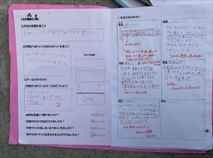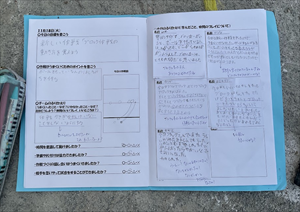ゲームが終わると全員で集まり「今日のふりかえり」をします。得点につながったプレーはどんな作戦だったのか、失敗した作戦は何が原因だったのかなど、ノートにまとめて次のゲームに生かせるようにしていきました。