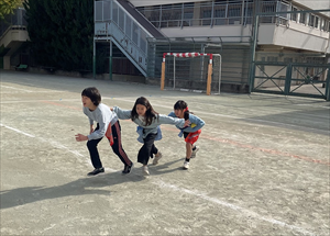 「三人で縦に並んでとにかく全力疾走しよう。その時、ボールを持っている子は一番後ろに並んで、前の二人が、ディフェンスが来ないようにブロックして前に進んでいこう」