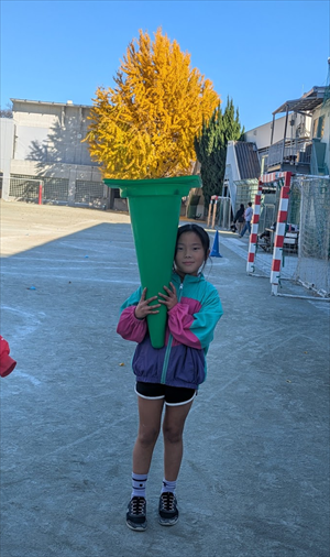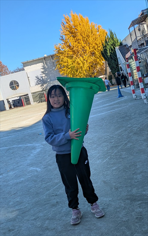授業終了後、使用した道具を片付ける時に子どもたちと一緒に遠近法あそびをしました。巨大なソフトクリームの完成!!片付けも楽しむこどもたち!素敵です。