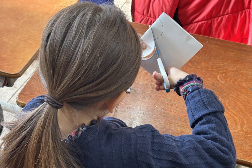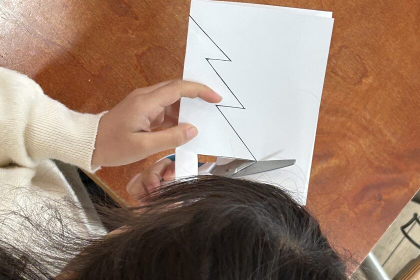 選んだ形の紙には、あらかじめ線が書かれてあり、紙を二つに折って重ねて切れば、ハートや雪だるま等の形ができあがり!