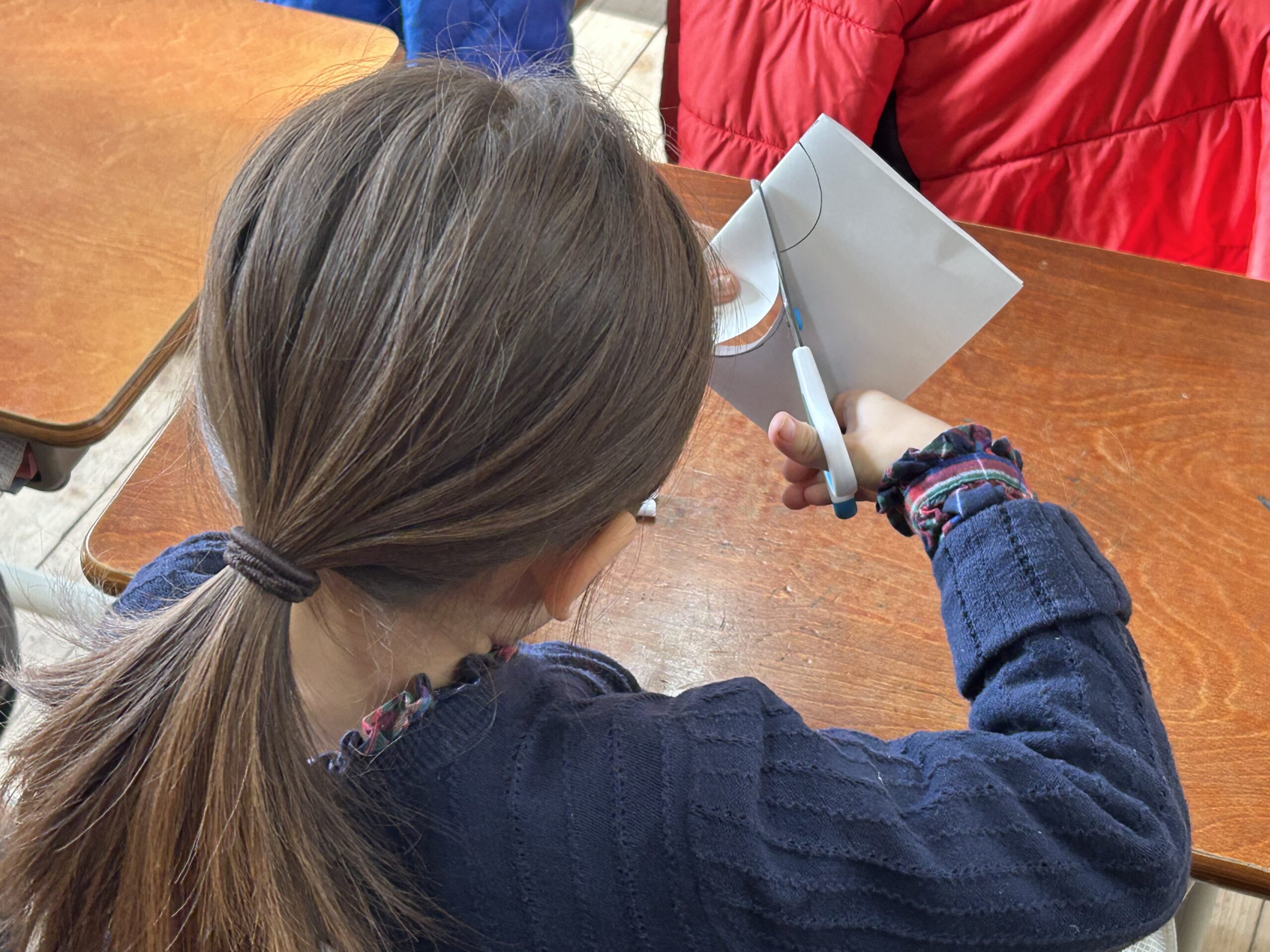 選んだ形の紙には、あらかじめ線が書かれてあり、紙を二つに折って重ねて切れば、ハートや雪だるま等の形ができあがり!