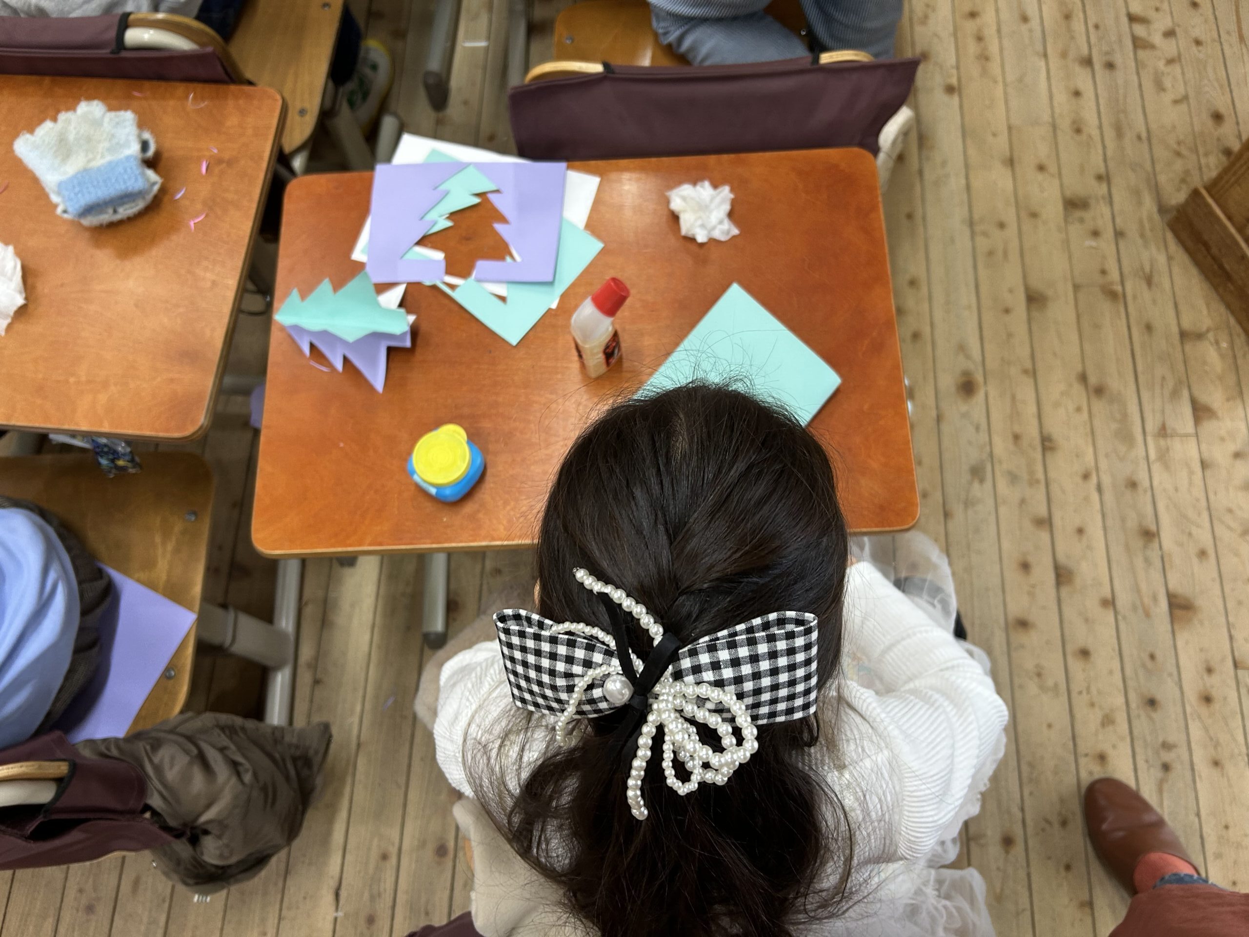 明星では、色々な感触の物に触ってもらいたいと思っていますので、低学年の美術では「青いカップに入ったのり」を使い続けています。