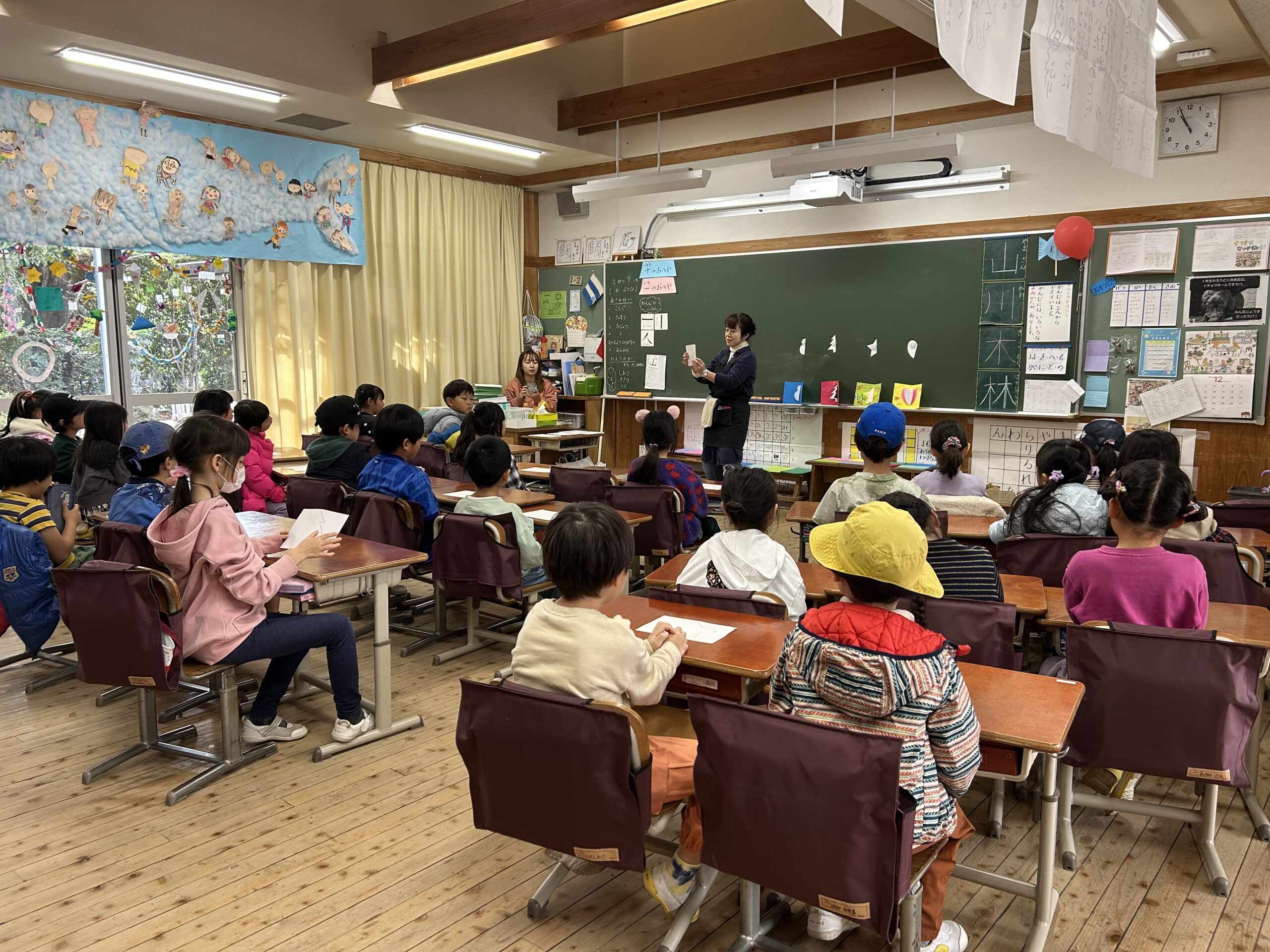 最初に、どんなカードを作るのか、子どもたちにイメージをもってもらえるように、カードを紹介しました。