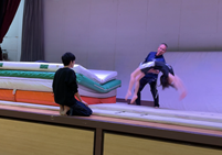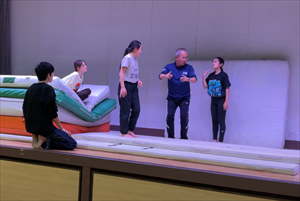 背もたれのない椅子に座った状態から、大きなマットの上に後ろ向きにジャンプ、という動作から練習しました。バク転の前半の動き、後ろに飛ぶというイメージづくりです。