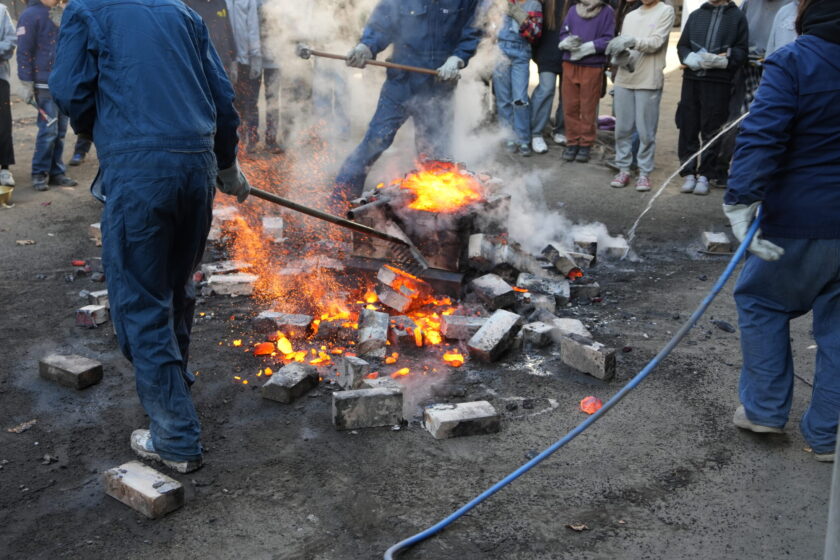 炉の周りに6年生が大集合。おそろいのつなぎを着た担任が壊していきます。ホースで水をかけているのは、社会科専科のえぐっちゃん。