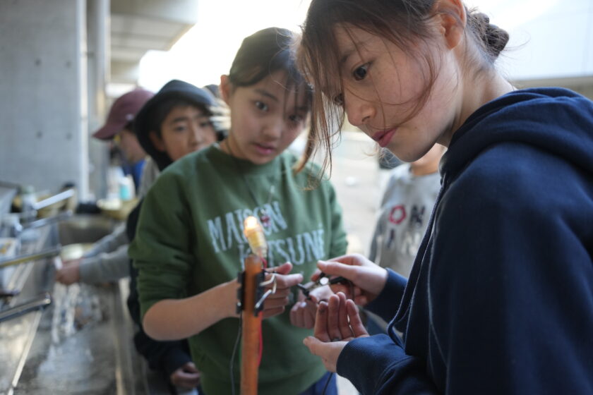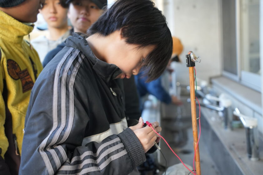探し出した黒い物体が、鉄か否かを確認するために、豆電球に明かりがつくかつかないかを試している子どもたち。