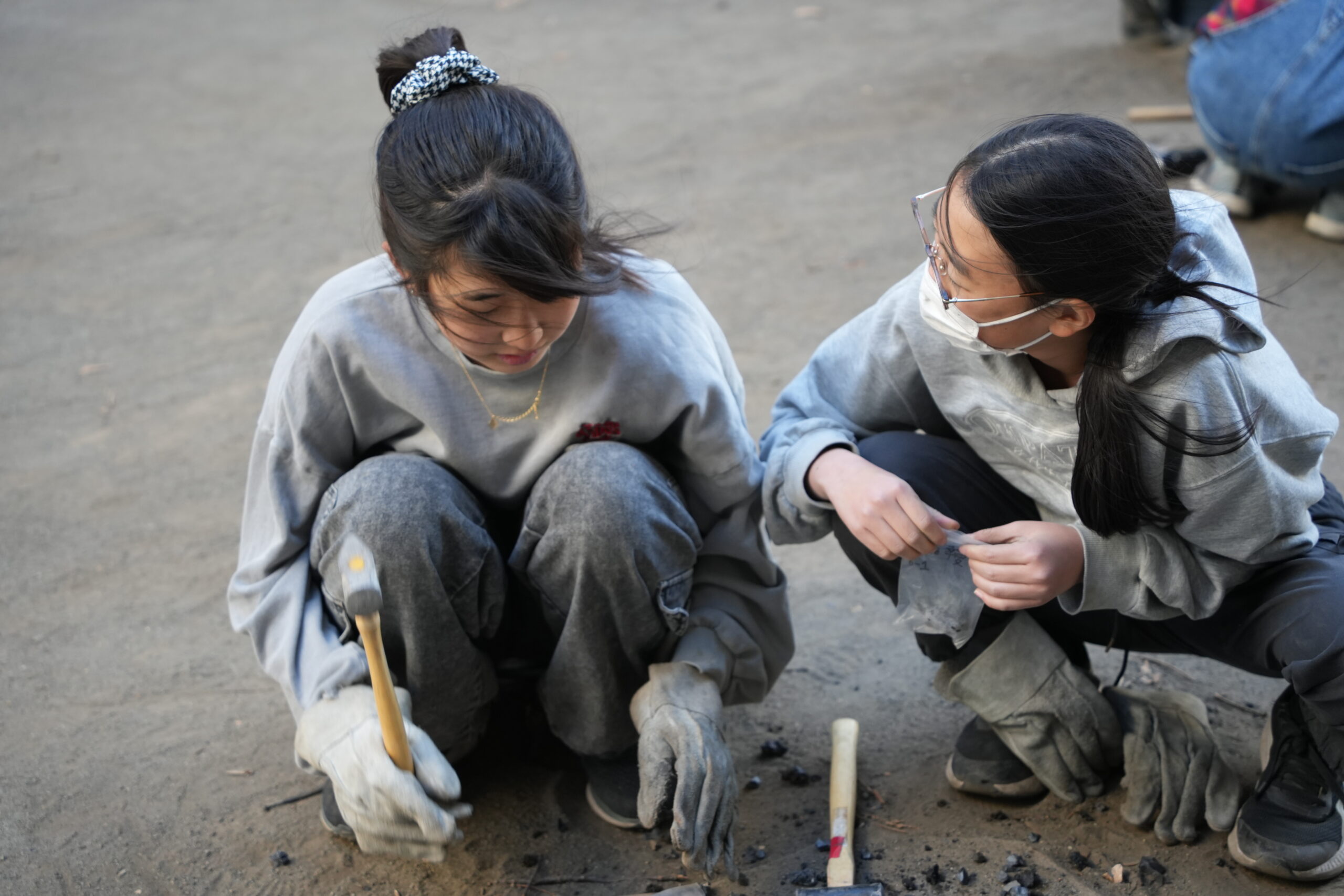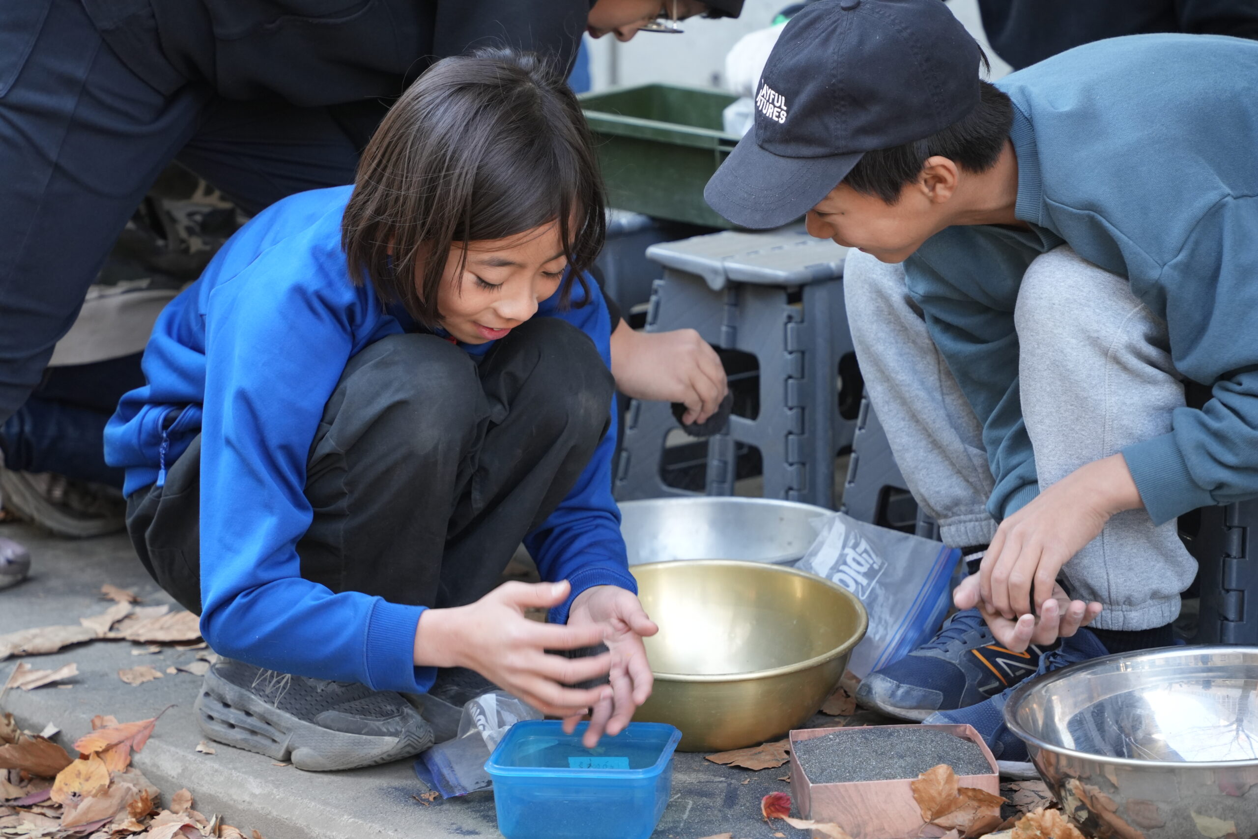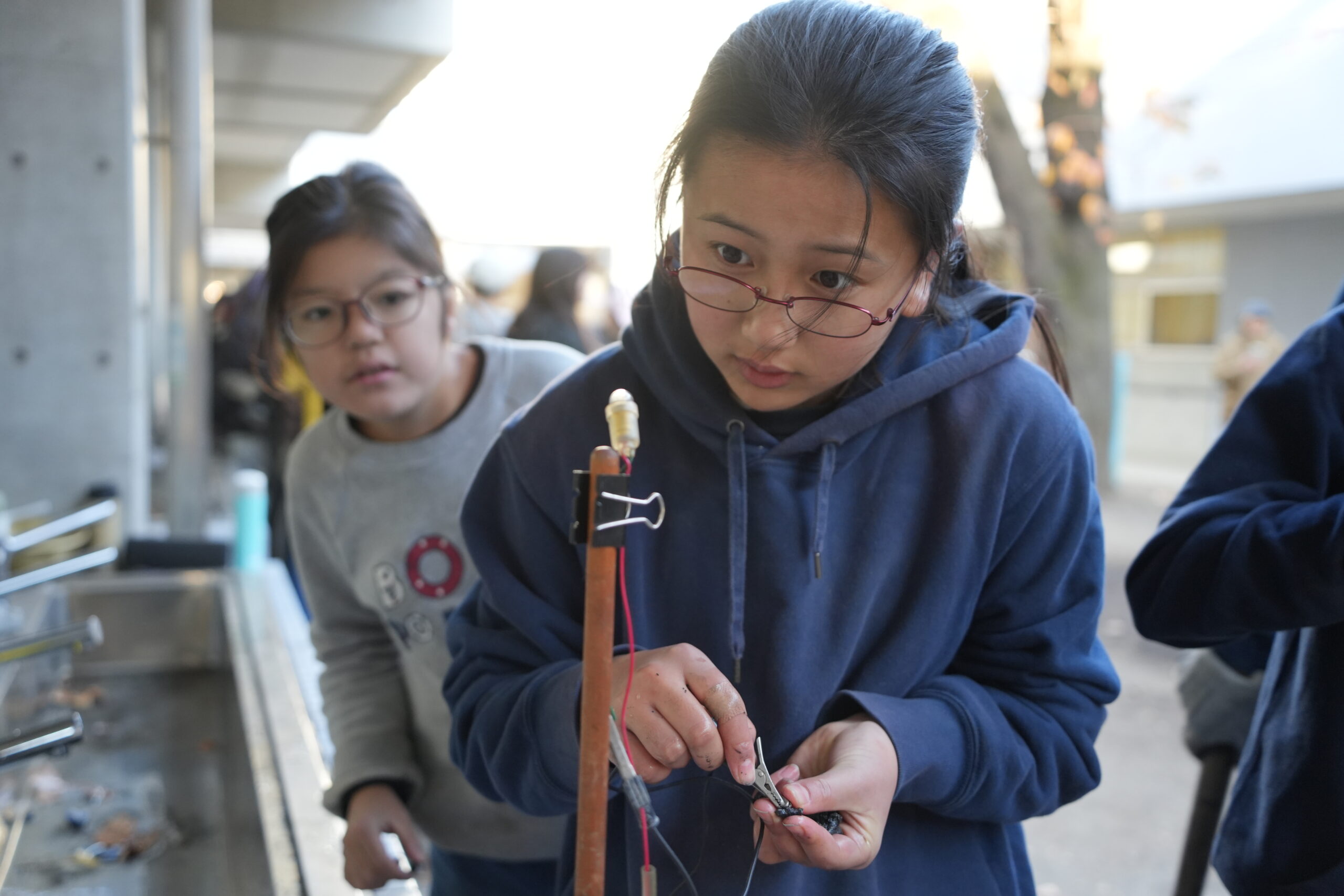 探し出した黒い物体が、鉄か否かを確認するために、豆電球に明かりがつくかつかないかを試している子どもたち。