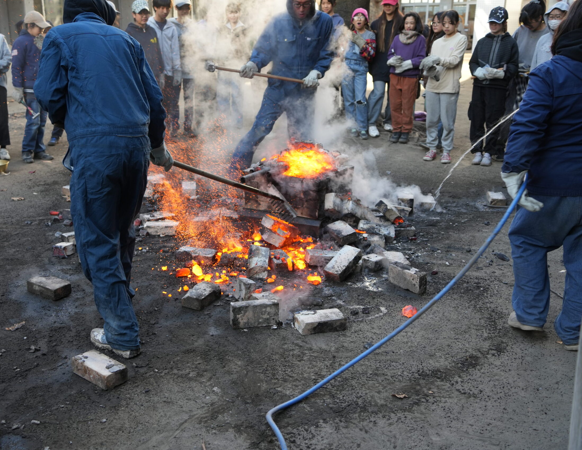 砂鉄は、夏季生活で6年生が千葉県の千倉町瀬戸浜で採取してきたものです。炉の中は、なんと1538℃以上になっているのだそうです!