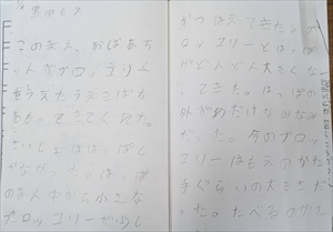 この前、おばあちゃんがブロッコリーを植えた植木鉢をもってきてくれた。最初ははっぱしかなかった。はっぱの真ん中から小さなブロッコリーが少しずつ生えてきた。ブロッコリーと葉っぱがどんどん大きくなってきた。はっぱの外側だけなみなみだった。今のブロッコリーは私の片手ぐらいのおおきさだった。食べるのがたのしみだな。横からちいさなブロッコリーがでた。