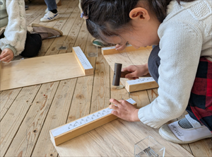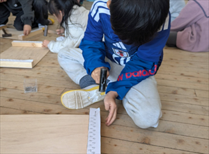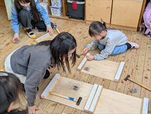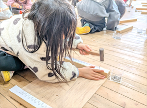 ビー玉滑り台で、何度も釘打ちの練習をしてきた子どもたちなので、とても手つきがよく、上手に釘を打っていきました。