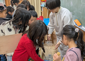 「釘は半分だけ打ち込んで、のこりの半分がでているようにしてください」「みんなの親指の高さぐらいを残して打つといいよ」