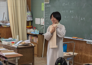 1年生3学期の総合は「ポシェットづくり」に挑戦。毛糸を使って平織(ひらおり)の織物を仕上げていきます。織機を作る所から子どもたちの手作りです。
