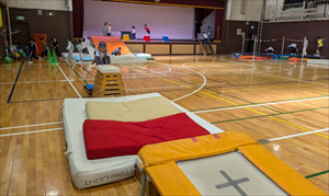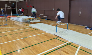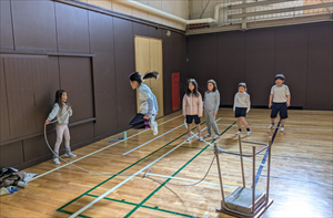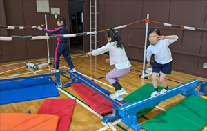 体育の授業や運動遊びにおける「サーキット運動(サーキットトレーニング)」は、複数の運動スポットを連続して回る活動です。体育館にある器具をほぼすべて出して、周回コースをつくりました。このサーキットを体育専科の名前(冨田)と、都内にある某遊園地の名前から「とみうりランド」と名付けました。準備や片付けがとても大変なので、これをやるのは1年に1回から2回程度。子どもたちに大人気の活動です。