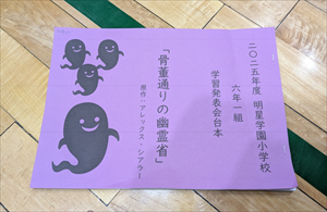6年1組の劇のタイトルは「骨董通りの幽霊省」。アレックス・シラー作の児童書を元に担任の伊藤先生が脚本を書き、それを読んだ子どもたちがさらに工夫を重ねてセリフや演出を加えていきながら台本にしあげていったそうです。ピアノ伴奏や照明なども分担して行っていましたよ。さすが6年生ですね。