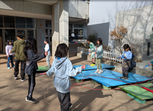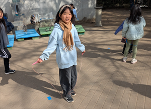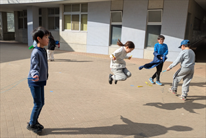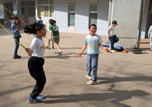 寒さに負けず、休み時間になると、教室の前庭やグラウンドの端などで多くの子どもたちがなわとびの練習に励んでいます。イチョウ広場にある赤井先生の銅像の前からも、リズムの良い縄の音と楽しそうな声が聞こえてきます。高学年の子どもたちが低学年の子たちになわとびを教えていました。