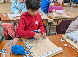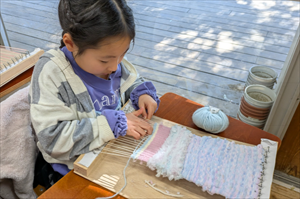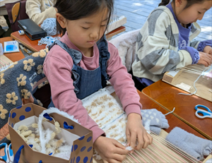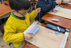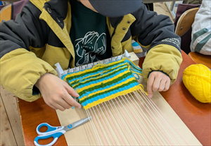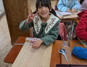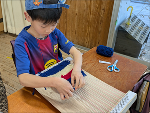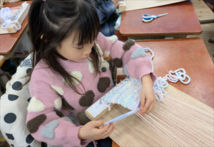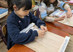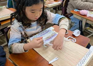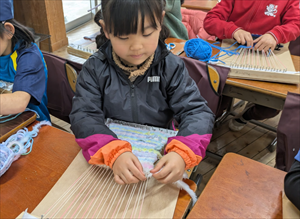 もこもこでカラフルな毛糸を一本ずつ交互に通していく作業は、一年生にとってそう簡単ではありません。最初は苦戦していた子も、だんだんと慣れてきて編むスピードも速くなってきました。