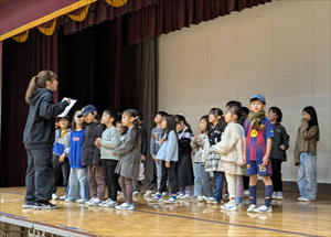 1年生のまっすぐな歌声は、とってもかわいらしくて、聞いているだけで元気が湧いてきます。最初はすこしむずかしかったメロディーも今では、声を合わせてバッチリとうたえるようになりました。