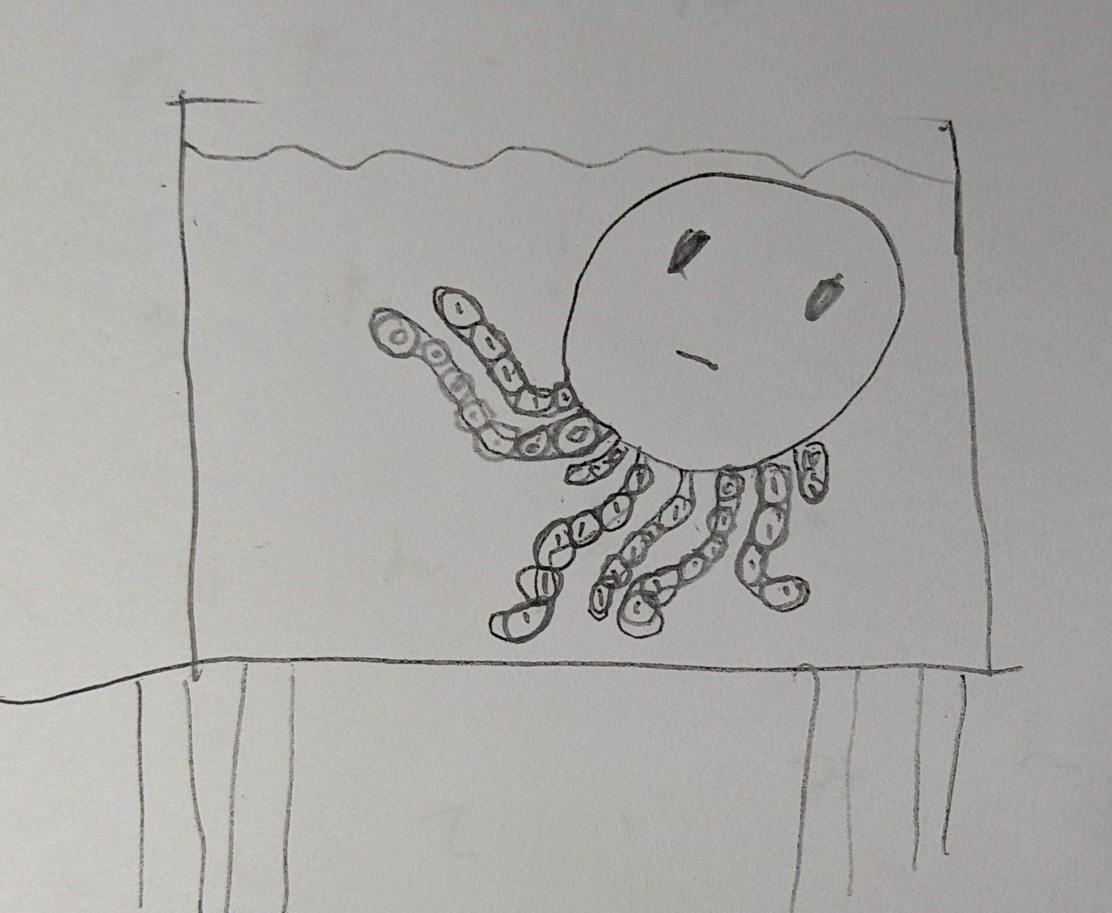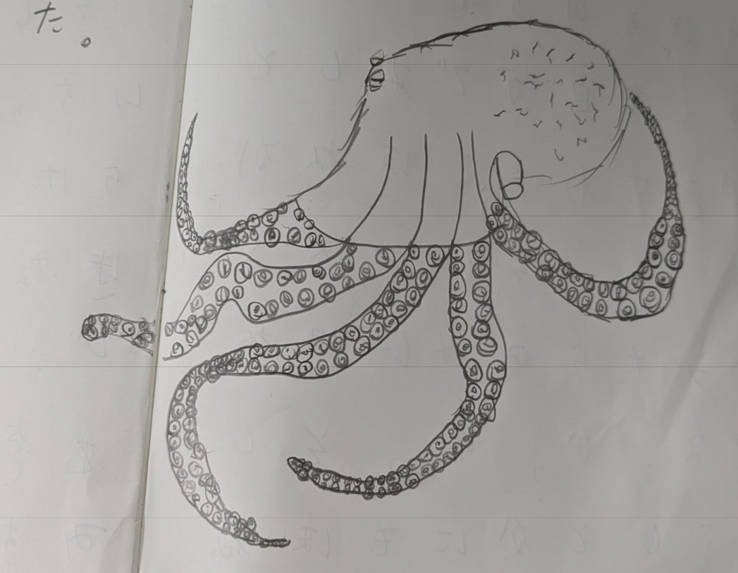 今日、先生が 水そうに 入れた タコを もってきた。そして、みんなは こうふんして 「いきてるの?」とか「ほんもの?」とせんせいに きいていた。 それは ほんとうに いきている タコだった!!! せんせいと じゃんけんを して かったじゅんばんで グループで タコをさわりにいった。 わたしたちは 4ばんめだった。さわりごこちは おなかが ふわふわで きゅうばんは くっついた。 つぎに もちあげて みた。でもだれも もちあげられ なかった。 2人目の子がもちあげようとしたとき、 タコは すみを はいた。そのあと、先生がまた もちあげたら、また タコはすみを はいた。