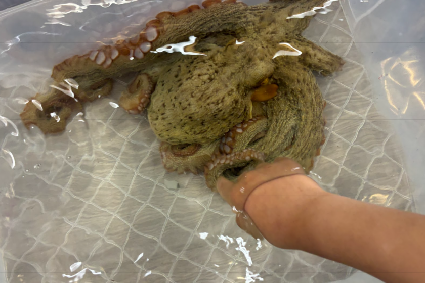 今日はタコのべんきょうをした。 先生が「前にあつまって」って言った。タコがいた。まず動き方をかんさつしてグネグネしたうごきだった。人間には足のほねが あるけど、マダコには 足のほねが ないから歩けてて すごいって思った。そのつぎに、先生が「さわりたい人」ってきいた。じゃんけんをした。