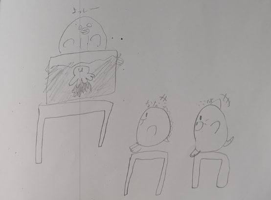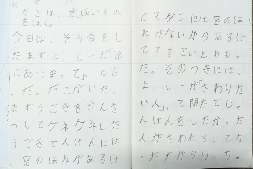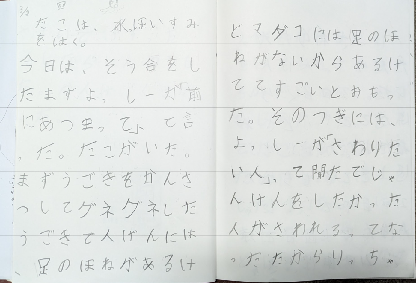 今日、マダコをかんさつしたよ。 きゅうばんの ところが しいたけの やねみたいだった。 さいごに 先生が タコをもち上げた。でも先生は うっかり、タコをおとした。そのとき、タコがすみをはいた。 だからみんなが すごい わらっていた。