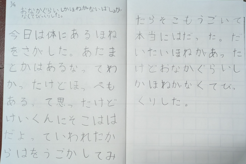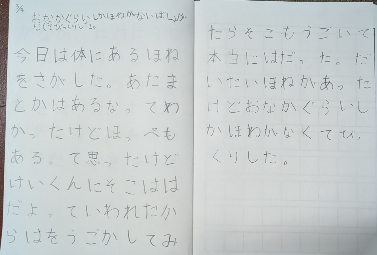 今日のそうごうで、 タコのうごきと 人のうごきを くらべた。それで、かたいところさがしの 紙をもらって書いた。人間の顔がほとんど ほねで できてるんだって おもったよ。首にも 細長いほねがあったよ。 おなかだけは ほねがなかったよ。 鼻は上のほうだけ ほねがあるんだって おもったよ。 でもタコはかたいところが わからなかったよ。