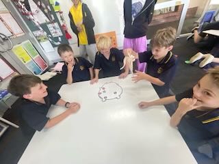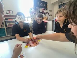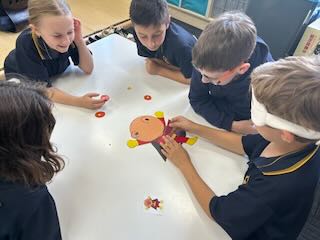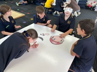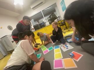 ルールがわかったら、6グループに分かれてやってみます。目隠しをする子、顔のパーツを渡す子、「もうちょっと右!」など言葉でヒントを出す人、それぞれ役割が自然に決まりながら、楽しんで遊んでくれました。グループごとに福笑いを交換して、違うキャラクターで楽しんだりもしていました。とにかくいつまででも遊んでいられる、そんな空気の授業にすることができました。