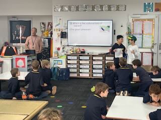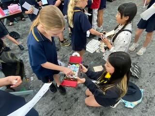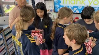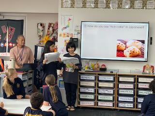 台本を何度も何度も読んで練習をして、どうしても発音できない単語には読み仮名をふって練習してきました。その練習努力は見事に花開き、最高のプレゼンテーションになりました。Woodendの子どもたちもとても楽しんでくれて、最後に配ったお土産も大喜びしてくれました。