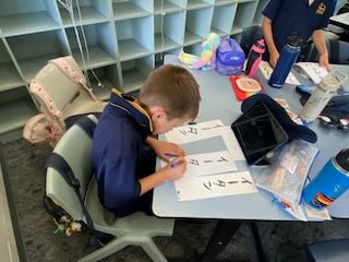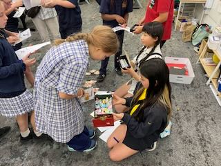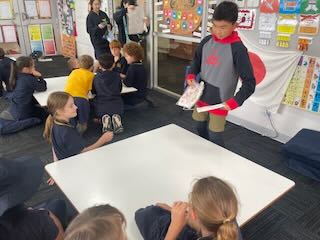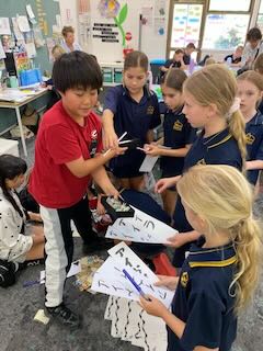 2時間目、3時間目には他のプレゼンテーションも行われました。「習字」をやったチームもありました。あらかじめ、Woodendのクラスメイトの名前をカタカナでお手本として書いておき、それを見ながら筆ペンで実際に書いてみる、という授業です。Woodend校では日本語の授業がありますが、なかなかカタカナまでは書くことができません。書き順もわからない自分の名前を筆ペンで書くのはなかなかのチャレンジです。下から上へ。。。右から左へ。。。あっちを書いて、急にこっちを書いて。。。いいのです(^ ^)。それで全く問題ありません。自分の名前を日本の「Fude」で書いたことに意味があります。