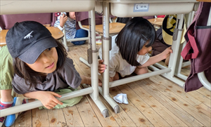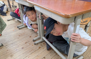 教室をのぞいてみると、1年生もしっかりと机の下に潜り込み、頭を守る行動をしていました。