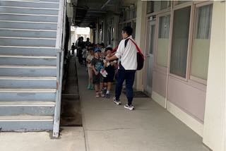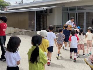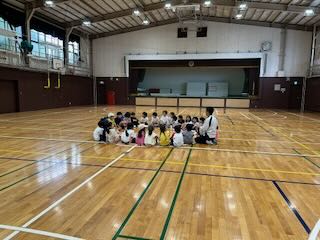 どこからか、「せ〜んろはつづく〜よ〜♪どーこーまーでーも〜〜♪」『ぽっぽーーーーー!!』とギターに合わせて元気な低学年の子どもたちの声。聞こえてくる方を見に行ってみると、体育担当のトミー(冨田先生)のギターに合わせて、笑顔100%の1年生の列車がゆっくり体育館にしゅっしゅぽっぽと向かってきます。今日は1年生2回目の体育。教室から体育館までの移動は、トミーのギターに合わせて歌を歌いながらの移動。新品ピカピカの体育館シューズを抱えながら。ただこれから始まる「たいいく」という授業にワクワクドキドキ胸を高鳴らせながら。