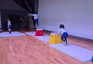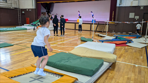 大きなマットの上を転がったり、平均台を渡ったり、全身を使って思いっきり体を動かしました。「小学校1年生をプレ体験」となった一日。今後も学校の雰囲気を直接体験していただけるイベントを用意しております。また皆様とお会いできる日をこころより楽しみにしております。