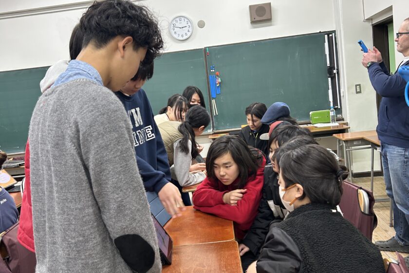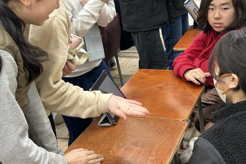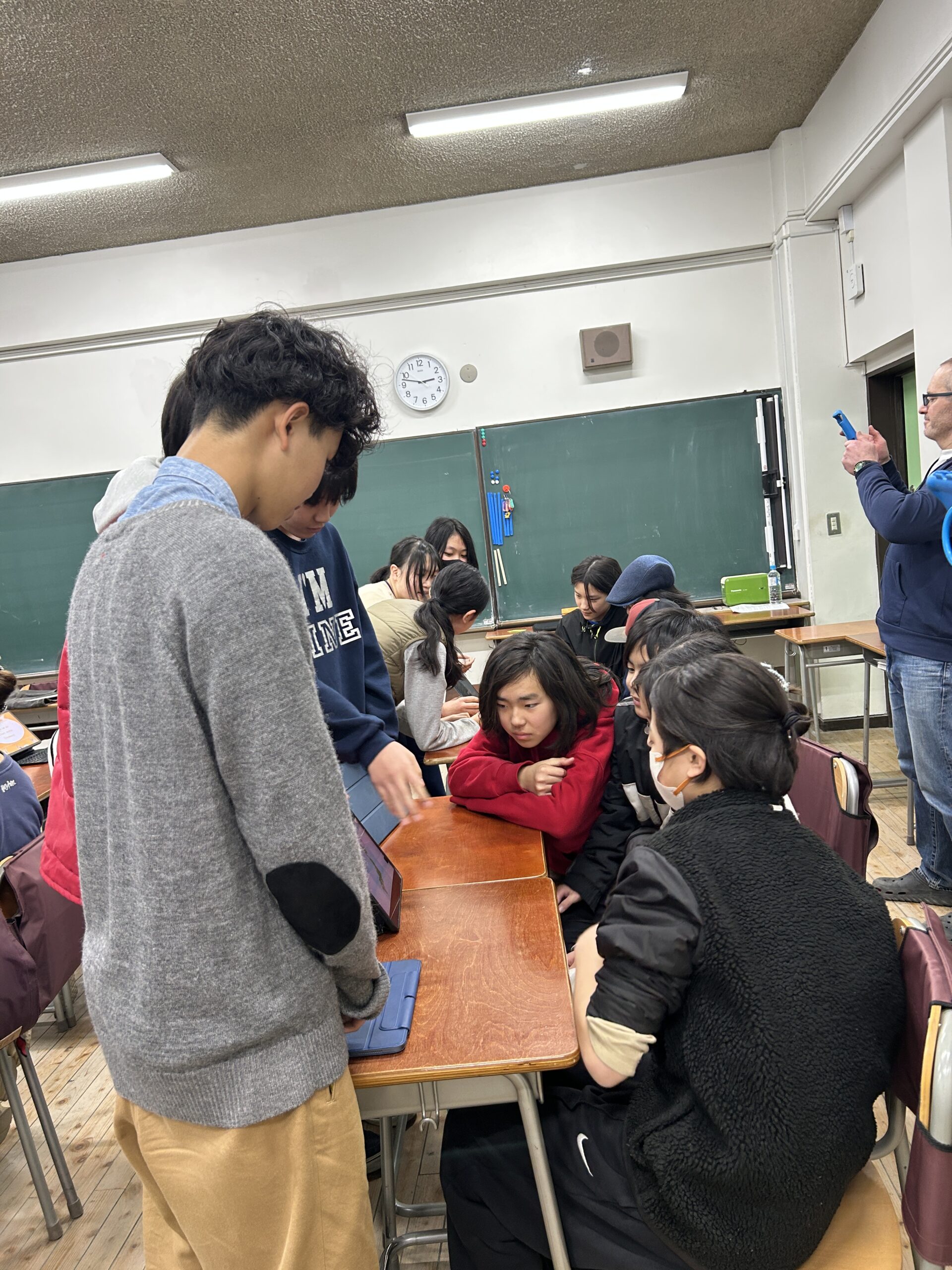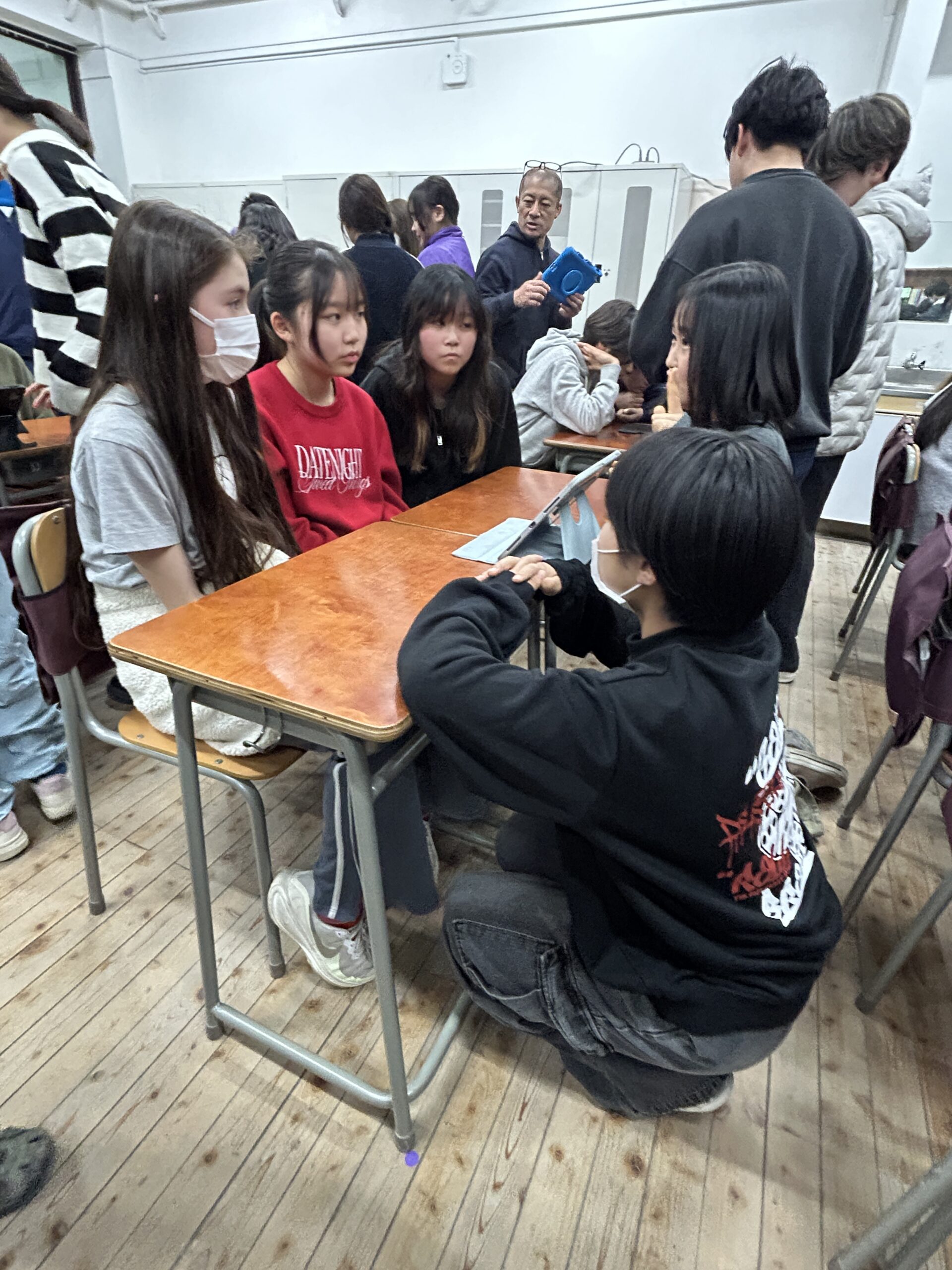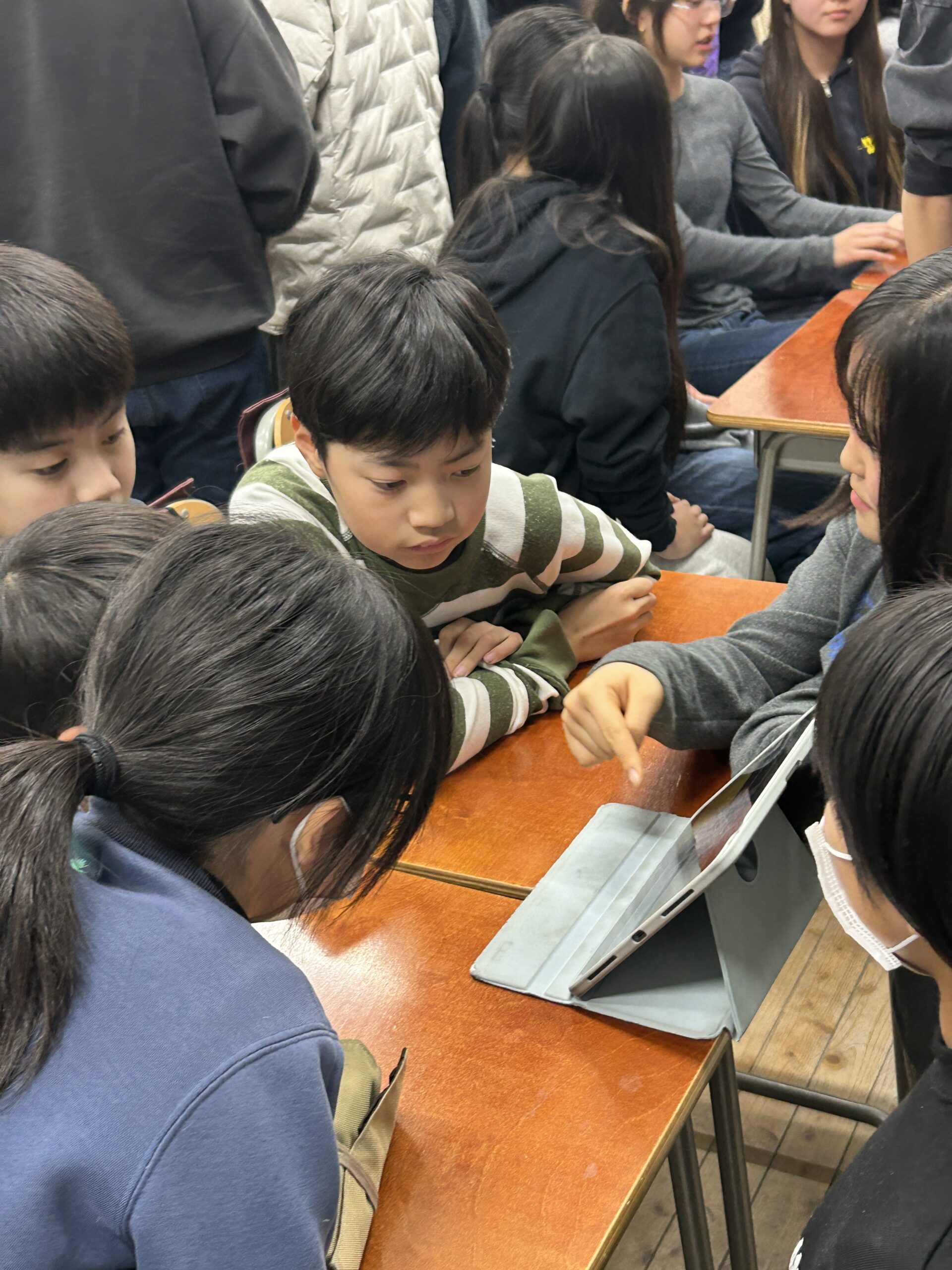事前に6年生の子どもたちの興味関心が高まる様に、短いビデオクリップまで制作してくれました。お弁当の時間に6年生の教室で上映。みんな「おーー!面白そう!」と一気にモチベーションがアップ!タイトル通り、わくわくが止まらない様子で中学校の教室に向かいました。